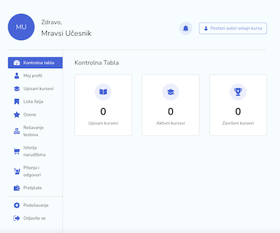 Nakon uspešne registracije otvoriće se konktrolna tabla tvog profila. Proveri svoje ime i prezime, jer ono će kasnije biti na sertifikatu sa kursa. Videćeš da nemaš ni jedan upisan kurs, pa je potrebno da se upišeš na željeni kurs.
