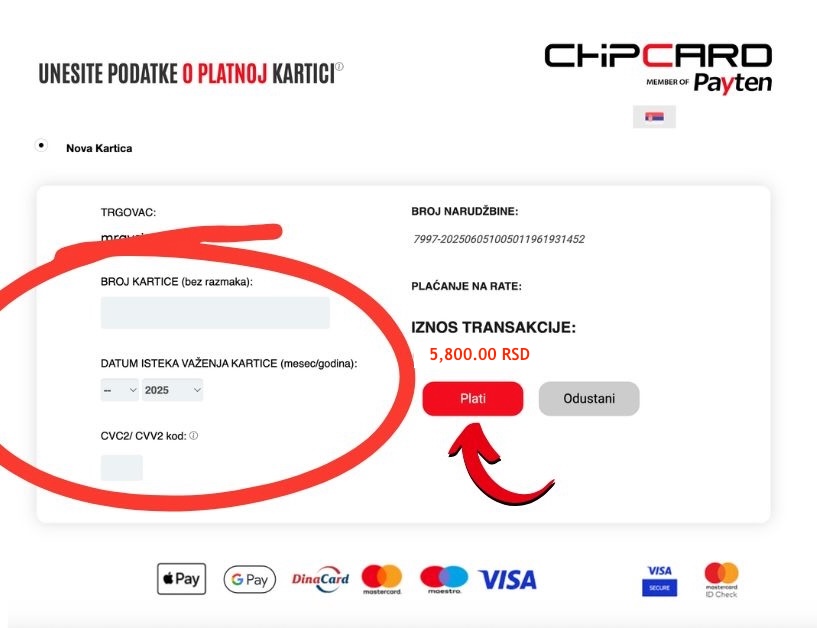 Vrlo je važno da u desnom dijelu odaberete opciju: Plaćanje karticom. Nakon toga označite kućicu da prihvaćate uvjete plaćanja i kliknite gumb Naruči