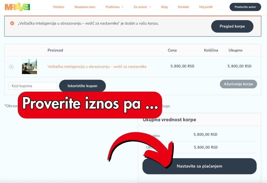 Nakon toga će se otvoriti nova stranica koja predstavlja vašu košaricu na ovoj stranici i proizvode koje imate u toj košarici. Potreban vam je samo ovaj jedan online tečaj. Ovde će cena biti prikazana u dinarima, ali ne brinite, Vaša banka će taj iznos konvertovati u 398 kuna. Provjerite je li tako i kliknite Nastavi sa plaćanjem…