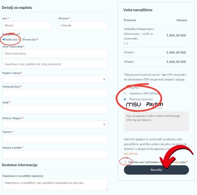 Zatim se otvara stranica na kojoj trebate ispuniti polja svojim podacima. Unesite točne podatke kako biste mogli primiti račun i potvrdu da ste platili ovaj tečaj.