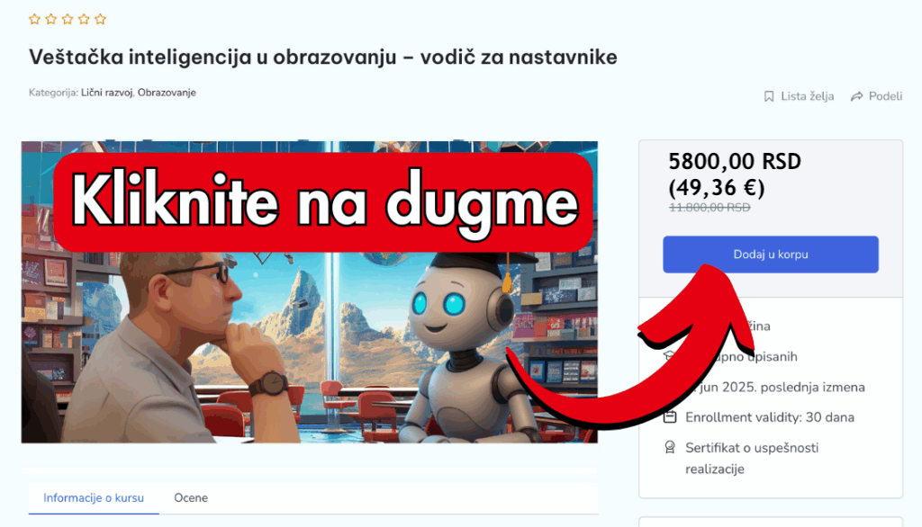 Sljedeći korak je otići na stranicu online tečaja Umjetna inteligencija u obrazovanju – Vodič za nastavnike i izvršiti uplatu